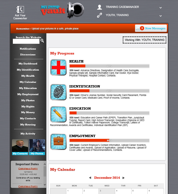 My JumpVault is an intuitive, youth envisioned web application developed under the direction of a group of young adults in the Florida foster care system. My JumpVault was developed as a tool to provide foster youth a secure place to easily upload, store and manage the vital information that life requires, including important health, education and employment documentation. My JumpVault will automatically populate information from the Florida Safe Families Network (Florida's Statewide Automated Child Welfare Information System - SACWIS) and the Sunshine Health data warehouse to provide information to users.